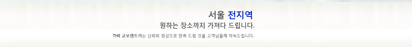 주소 : 서울시 마포구 서강로30, 408호 (창전동, 동원스위트뷰) ㅣ 상호 : 주식회사 THE 교보렌트카 ㅣ 대표자 : 신승한 사업자등록번호 : 704-87-00097 ㅣ 통신판매업 : 제2015-서울마포-0804호 ㅣ 전화 : 1661-7158 ㅣ 팩스 : 02-6925-0060