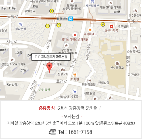주소 : 서울시 마포구 서강로30, 408호 (창전동, 동원스위트뷰) ㅣ 상호 : 주식회사 THE 교보렌트카 ㅣ 대표자 : 신승한 사업자등록번호 : 704-87-00097 ㅣ 통신판매업 : 제2015-서울마포-0804호 ㅣ 전화 : 1661-7158 ㅣ 팩스 : 02-6925-0060